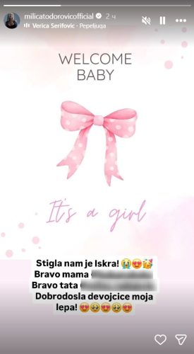 „Stigla nam je Iskra! Bravo, tata i mama, dobro došla, moja lepa devojčice“, napisala je Milica Todorović putem Instagrama.