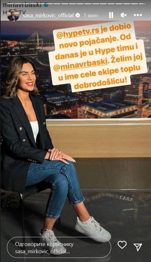 Ona je novo lice Hype televizije, a direktor i vlasnik Hype produkcije, Saša Mirković, poželeo joj je srdačnu dobrodošlicu putem svog Instagram profila.