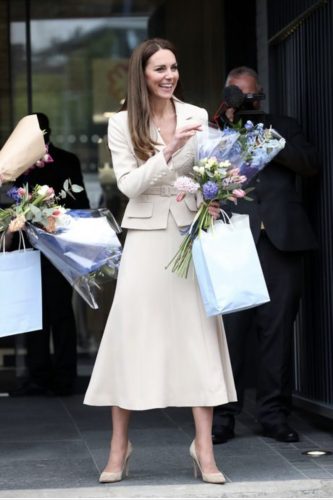 Vojvotkinja je obukla bež komplet koji se sastoji od lepršave suknje i sakoa, a mala pismo torba i salonke u istoj boji upotpunile su kombinaciju.