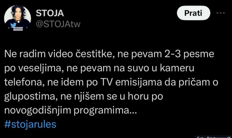 Pevačica Stoja Novaković aktivna je na društvenim mrežama, a ovaj put je potkačila svoje kolege sa estrade. Naime, pevačica je pratiocima napisala šta nikada ne radi, te ismejala kolege.