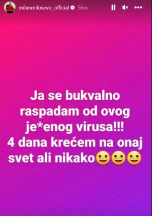 Milan Milošević se obratio javnosti putem društvenih mreža gde je izrazio svoju frustraciju zbog teškog stanja u kojem se nalazi. „Ja se bukvalno raspadam od ovog j*benog virusa! Četiri dana krećem na onaj svet, ali nikako“, napisao je Milošević u jednom od svojih objava.