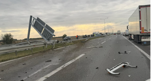 Na sreću, nema povređenih, ali je pričinjena velika materijalna šteta, dok su delovi zaštitne ograde i konstrukcije saobraćajnih znakova razbacani po putu.