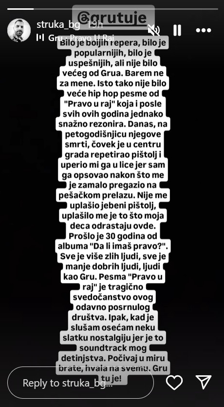 „Bilo je popularnijih repera, bilo je uspešnijih, ali nije bilo većeg od Grua, bar ne za mene. Isto tako nije bilo veće hip-hop pesme od „Pravo u raj“ koja i posle svih ovih godina jednako sanažno rezonira“, počeo je Struka putem Insta storija. Potom je opisao horor koji je preživeo.