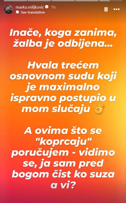 – Inače koga zanima, žalba je odbijena. Hvala trećem osnovnom sudu koji je maksimalno ispravno postupio u mom slučaju. A ovima što se „koprcaju“ poručujem – vidimo se, ja sam pred bogom čist ko suza a vi? – napisao je Miljković.