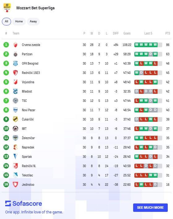 Novi Pazar je remijem došao do 40 boda i nalazi se na osmom mestu na tabeli pa je tako izborio plej-of, dok je Radnički na 14. poziciji sa 32 boda i igraće u plej-autu.