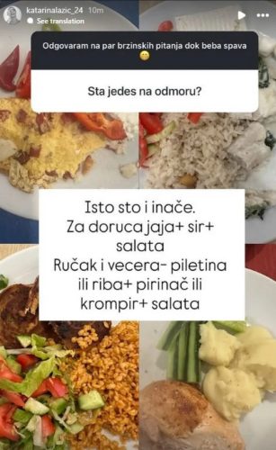 Katarinin jelovnik podrazumeva doručak bogat jajima, sirom i salatom, dok za ručak i večeru uglavnom bira piletinu ili ribu sa pirinčem ili krompirom, uz neizostavne salate.