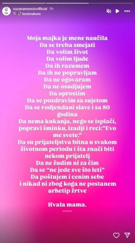Putem društvenih mreža Teodora otkriva kojim životnim lekcijama ju je majka naučila, a njene reči duboko su ganule Suzanu koja je ćerkine reči podelila i na svom profilu.