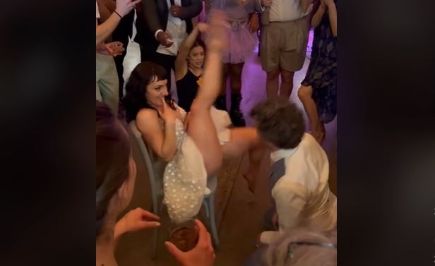 U TikTok klipu koji je sada prikupio 1,8 miliona pregleda, mlada je drsko stavila prst u usta dok je sedela na stolici sa nogom preko ramena svog muža.