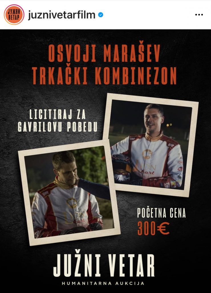 Gavrilu Đurđeviću je potrebna pomoć svih nas! Mi se pridružujemo i dajemo na licitaciju kombinezon koji Maraš nosi na početku filma – objavila je ekipa filma „Južnog vetra“.