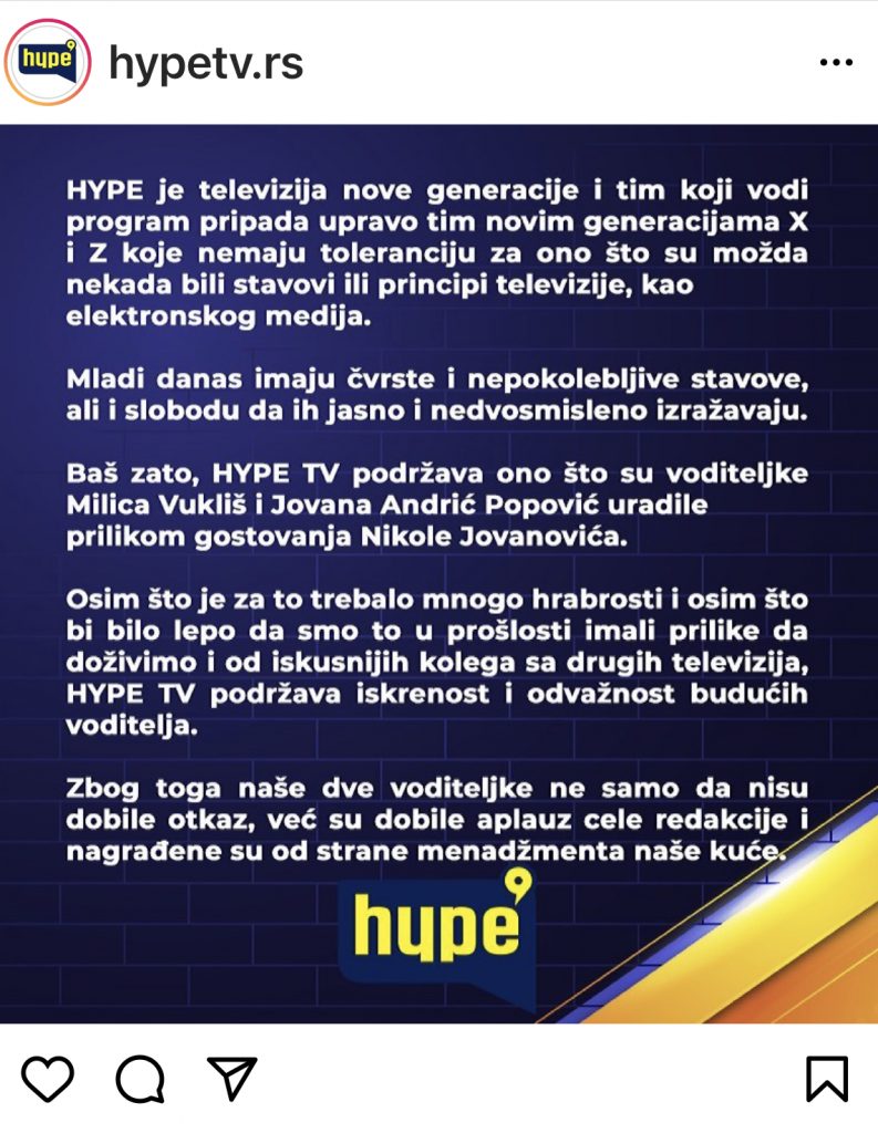 Baš zato, HYPE TV podržava ono što su voditeljke Milica Vukliš i Jovana Andrić Popović uradile prilikom gostovanja Nikole Jovanovića.