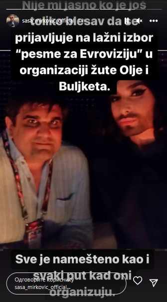 -Nije mi jasno ko je još toliko blesav da se prijavljuje za lažni „izbor pesme Evrovizije“ u organizaciji žute Olje i Buljketa. Sve je namešteno, kao i svaki put kada oni organizuju- napisao je Mirković u opisu fotografije na kojoj pozira sa nekadašnjom pobednicom Eurosonga, Končitom Vurst.