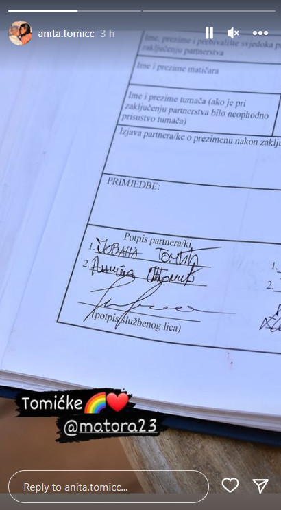 Tim povodom, Anita je na svom Instagram profilu podelila fotografiju na kojoj se jasno vide potpisi nje i njene supruge, a ono što se takođe može videti jeste da je Stanojlovićeva promenila prezime, tj. da je uzela Matorino, te je sada, po ovim papirima, Anita Tomić.