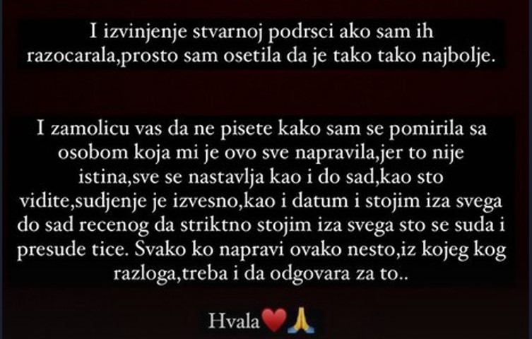 – I zamoliću vas da ne pišete kako sam se pomirila sa osobom koja mi je ovo sve napravila, jer to nije istina, sve se nastavlja kao i do sad, kao što vidite suđenje je izvesno, kao i datum i stojim iza svega do sad rečenog da strikto stojim iza svega što se suda i presude tiče. Svako ko napravi ovako nešto, iz kojeg god razloga treba i da odgovara za to – glasila je njena objava.