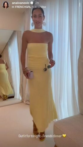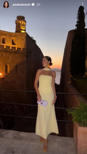 Ana je zablistala u nežnoj pastelno žutoj haljini koja prati liniju tela, dok se u donjem delu širi u plisirani kroj, savršeno ističući njenu vitku figuru i ženstvenost.