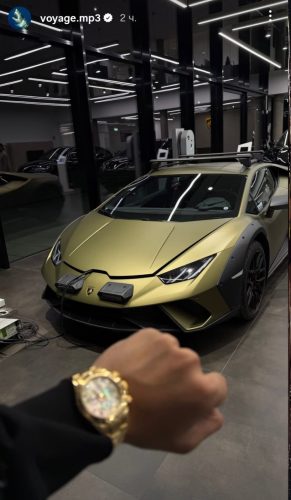 Na slici dominira Lamborghini Huracán, vredan čak 262.900 €, ali to nije sve…Vojaž je u kadru pokazao i sat u boji zlata, čija se vrednost procenjuje na 790 €.