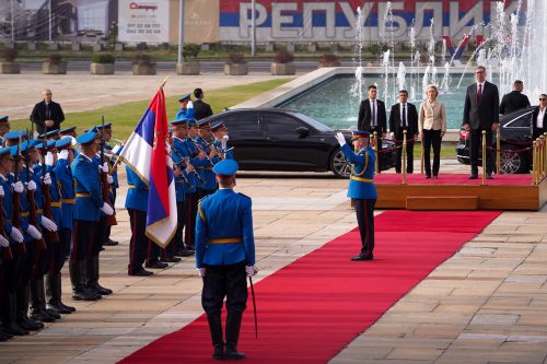 Predsednik Aleksandar Vučić dočekao je jutros ispred Palate Srbija predsednicu Evropske komisije Ursulu fon der Lajen koja boravi u zvaničnoj poseti Srbiji.