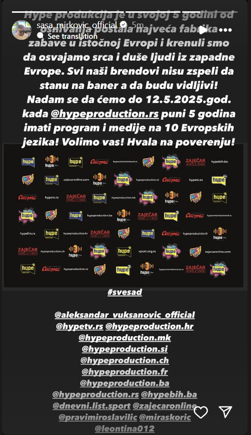 – Hype produkcija je u svojoj 5 godini od osnivanja postala najveća fabrika zabave u istočnoj Evropi i krenuli smo da osvajamo srca i duše ljudi iz zapadne Evrope. Svi naši brendovi nisu uspeli da stanu na baner, a da budu vidljivi! Nadam se da ćemo do 12.05.2025. godine kada @hypeproduction.rs puni 5 godina imati program i medije na 10 Evropskih jezika! Volimo vas! Hvala na poverenju! – napisao je Saša Mirković u svojoj objavi.