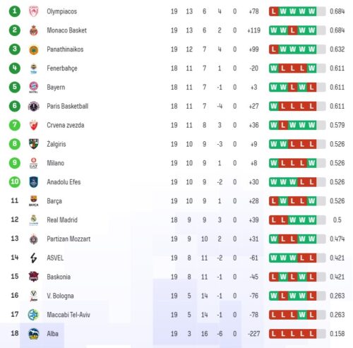 Evo kako sada izgleda tabela Evrolige posle novih pobeda večitih rivala nad Baskonijom, odnosno, Makabijem.