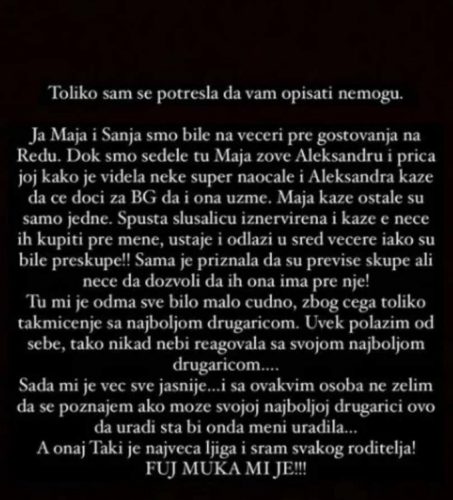 „Maja kaže ostale su samo jedne. Spušta slušalicu iznervirana i kaže: ‘E, neće ih kupiti pre mene’, ustaje i odlazi usred večere da ih kupi, iako su bile preskupe. Sama je priznala da su previše skupe, ali da neće da dozvoli da ih ona ima pred nje. Tu mi je odmah sve bilo malo čudno, zbog čega toliko takmičenje sa najboljom drugaricom. Uvek polazim od sebe, tako nikad ne bih reagovala sa svojom najboljom drugaricom. Sada mi je već sve jasnije, i sa ovakvim osobama ne želim da se poznajem. Ako može svojoj najboljoj drugarici ovo da uradi, šta bi onda meni uradila. A onaj Taki je najveća ljiga i sram svakog roditelja. Fuj, muka mi je! – napisala je Jelena.