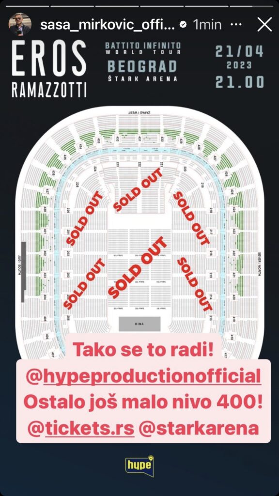 Ali, to nije sve. U istoj objavi, Mirković je najavio da je prodaja ulaznica za koncert Erosa Ramazzotti-a u Štark Areni 21. aprila u punom jeku te da je skoro rasprodan. Ostalo je još malo ulaznica samo za nivo 400 u Areni, što znači da će obožavaoci morati da požure ako žele osigurati svoje mesto na ovom spektakularnom koncertu.