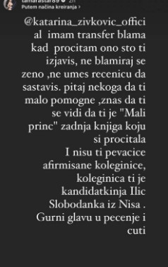– Imam transfer blama kad pročitam ono što ti izjaviš. Ne blamiraj se, ženo, ne umeš rečenicu da sastaviš. Pitaj nekog da ti malo pomogne, znaš da ti se vidi da ti je „Mali princ“ zadnja knjiga koju si pročitala. I nisu ti pevačice afirmisane koleginice, koleginica ti je kandidatkinja Ilić Slobodanka iz Niša. Gurni glavu u pečenje i ćuti – napisala je starleta i dodala: