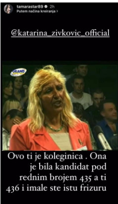 Naime, Tamara je na svom Instagram storiju uporedila Katarinu sa nekadašnjom kandidatkinjom na audiciji „Zvezda Granda“.