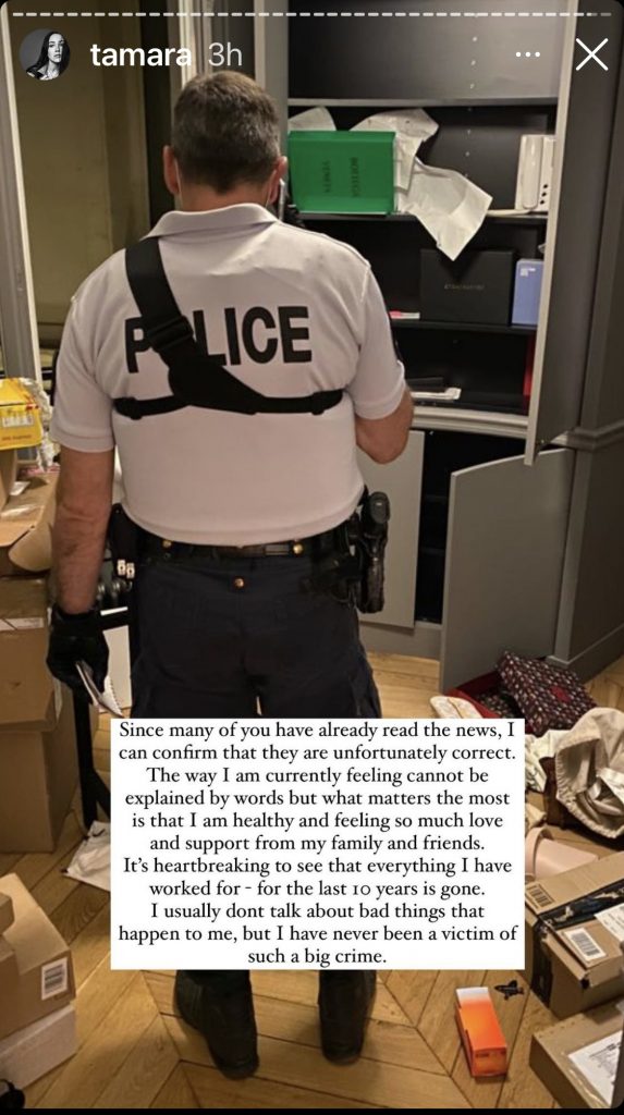 „Otkako je većina vas pročitala vesti, mogu da potvrdim da su one nažalost tačne. Ne mogu da opišem rečima kako se sada osećam, ali ono što je najvažnije jeste da sam ja dobro i da imam puno podrške i ljubavi od strane porodice i prijatelja. Poražavajuće je da sve ono za šta sam mukotrpno radila poslednjih 10 godina je nestalo. Ja inače ne pričam o lošim stvarima koje mi se dešavaju, ali nikada do sada nisam bila žrtva tako velikog zločina“, napisala je Tamara, i dodala: