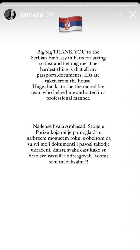 “ Najlepše hvala Ambasadi Srbije u Parizu koja mi je pomogla da u najbržem mogućem roku, s obzirom da su svi moji dokumenti i pasoši takođe ukradeni. Zaista svaka čast kako su brzo sve završili i odreagovali. Veoma sam im zahvalna!“