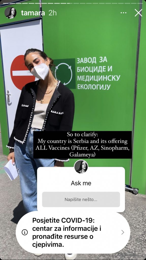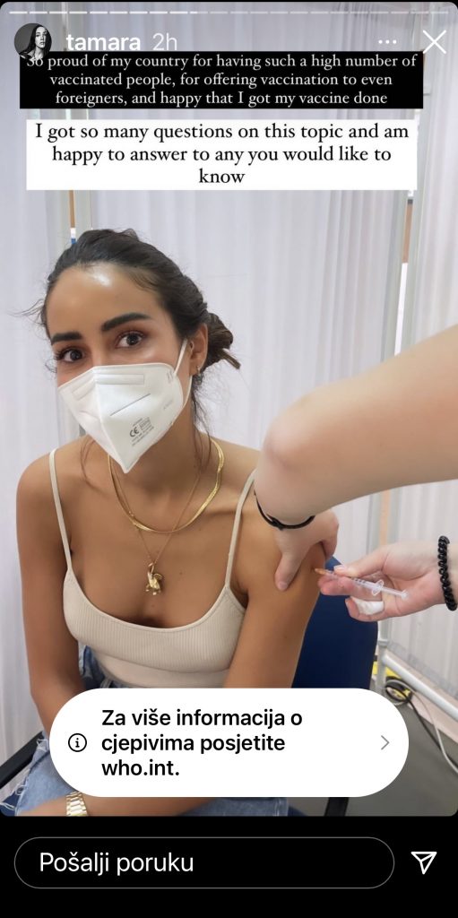 Naime, Tamara je na svom profilu objavila dve fotografije na kojima je ponosna jer se vakciniše protiv korona virusa, a i takođe na Srbiju u kojoj su dostupne četiri vakcine.