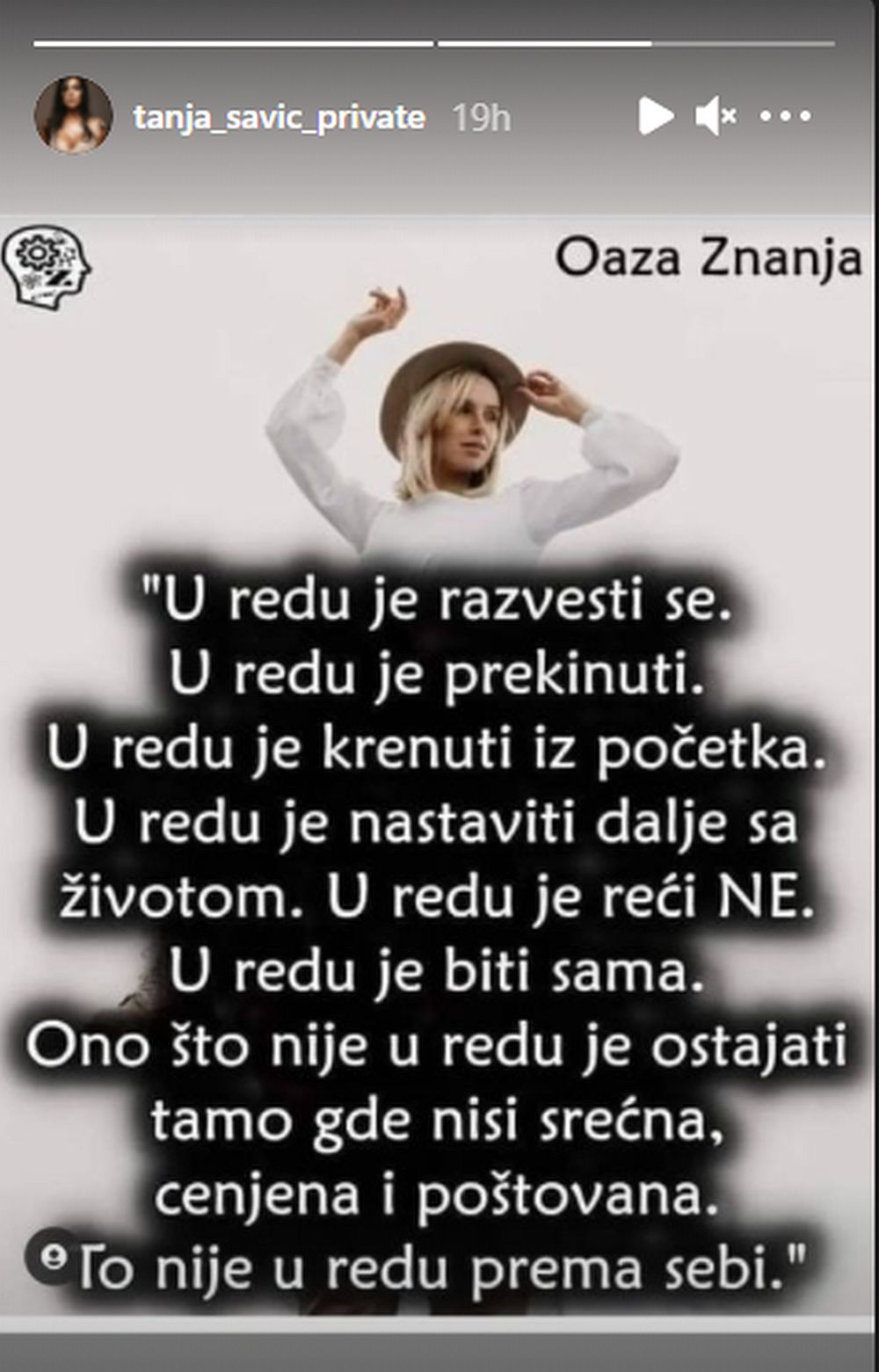 – U redu je razvesti se. U redu je prekinuti. U redu je krenuti iz početka. U redu je nastaviti dalje sa životom. U redu je reći ne. U redu je biti sama. Ono što nije u redu je ostajati tamo gde nisi srećna, cenjena i poštovana. To nije u redu prema sebi – pisalo je na sliku koju je Tanja objavila.