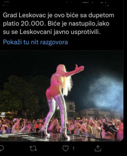 – Grad Leskovac je ovo biće sa dupetom platio 20.000 evra. Biće je nastupilo, iako su se Leskovčani javno usprotivili – glasio je jedan tvit.