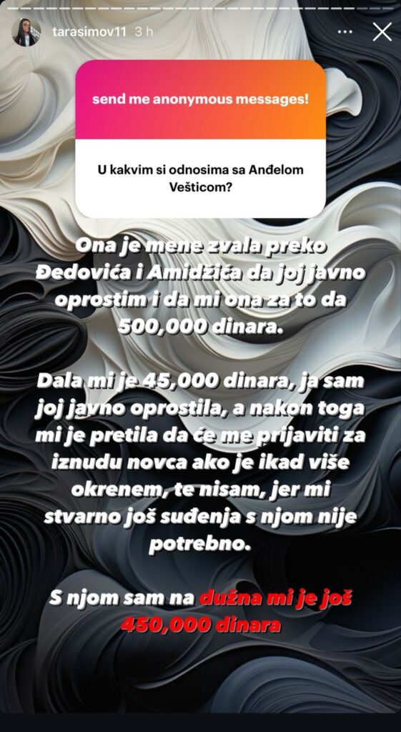 Tara Simov je odgovorila na pitanja svojih pratilaca na Instagramu, posebno se osvrnuvši na svoj odnos sa Anđelom Vešticom.