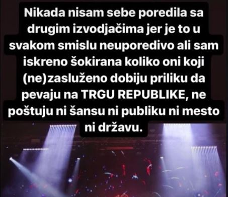 Naime ona je je na svom instagram storiju podelila svoje nezadovoljstvo nastupom pevačice Tee Tairović za doček nove godine na trgu republike u Beogradu. Tim povodom pop diva je na instagram nalogu napisala sledeće: