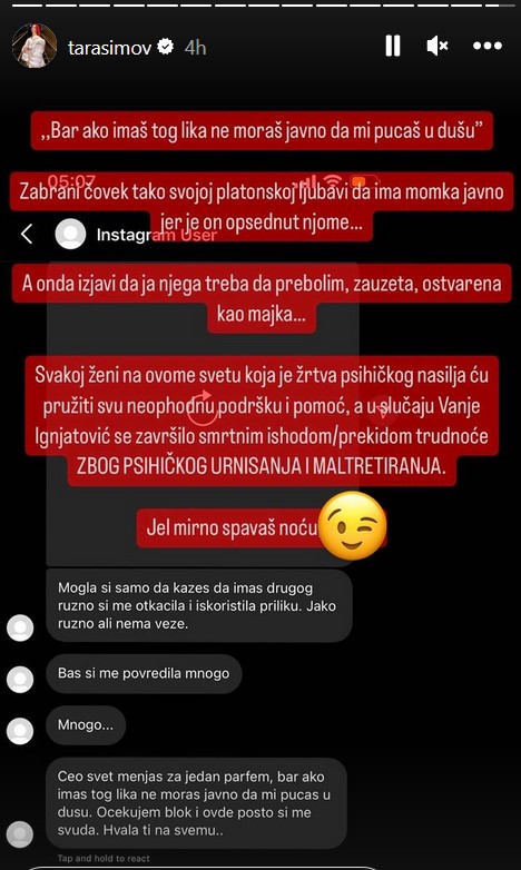 – „Bar ako imaš tog lika ne moraš javno da mi pucaš u dušu“. Zabrani čovek tako svojoj platonskoj ljubavi da ima momka javno jer je on opsednut njome. A onda izjavi da ja njena treba da prebolim, zauzeta, ostvarena kao majka. Svakoj ženi na ovome svetu koja je žrtva psihičkog nasilja ću pružiti podršku i pomoć, a u slučaju Vanje Ignjatović se završilo smrtnim ishodom/prekidom trudnoće zbog psihičkog urnisanja i maltretiranja. Je l’ mirno spavaš noću? – napisala je bivša zadrugarka na svom Instagram storiju.