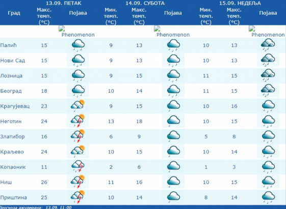 Oni ponegde na istoku i jugoistoku mogu biti praćeni i grmljavinom. Prema prognozi Republičkog hidrometeorološkog zavoda (RHMZ), najniža temperatura iznosiće od 8 do 13, a dnevna od 13 na severozapadu do 18 °C na jugoistoku i istoku zemlje.