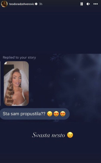 Teodora je snimala jako našminkano lice, dok je na glavi nosila veo. Na snimak je stavila emotikon prstena i znak pitanja. Zatim je na pitanje ženske osobe: „Šta sam propustila“, Tea odgovorila: „Svašta nešto“.