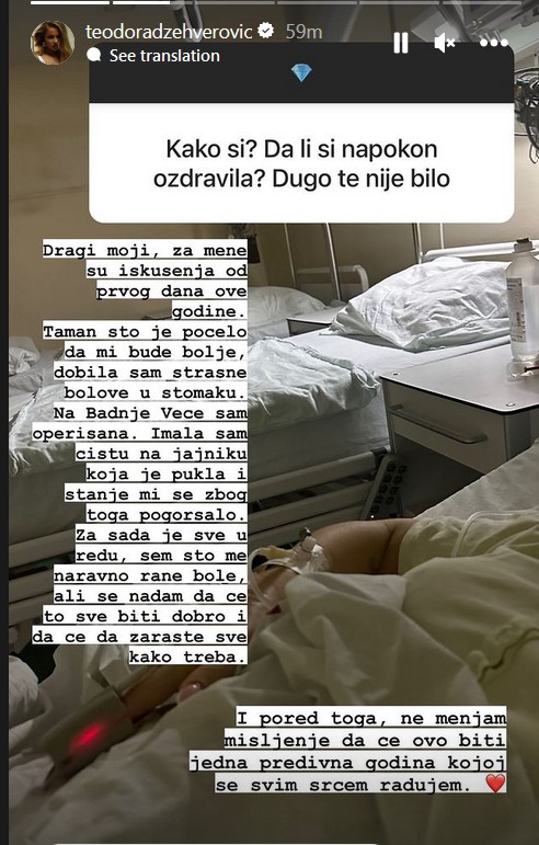 – Dragi moji, za mene su iskušenja od prvog dana ove godine. Taman što je počelo da i bude bolje, dobila sam strašne bolove u stomaku. Na Badnje veče sam operisana. Imala sam cistu na jajniku koja je pukla i stanje mi se zbog toga pogoršalo – započela je Teodora, a onda dodala da se sada oseća bolje: