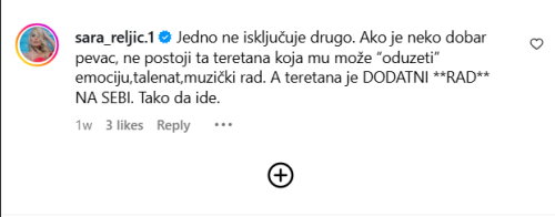 „Jedno ne isključuje drugo. Ako je neko dobar pevač, ne postoji ta teretana koja mu može ‘oduzeti’ emociju, talenat, muzički rad… A teretana je dodatni rad na sebi. Tako da ide“, istakla je Sara.