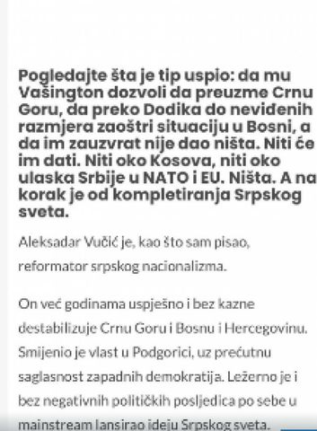 Pogledajte šta je tip uspeo: da mu Vašington dozvoli da preuzme Crnu Goru, da preko Dodika do neviđenih razmera zaoštri situaciju u Bosni, a da im zauzvrat nije dao ništa. Niti će im dati. Niti oko Kosova, niti oko ulaska Srbije u NATO i EU. Ništa. A na korak je od kompletiranja Srpskog sveta.