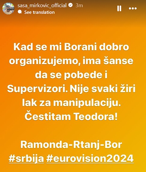 -Kad se mi Borani dobro organizujemo, ima šanse da se pobede i Supervizori. Nije svaki žiri lak za manipulaciju. Čestitam Teodora! – napisao je Mirković.