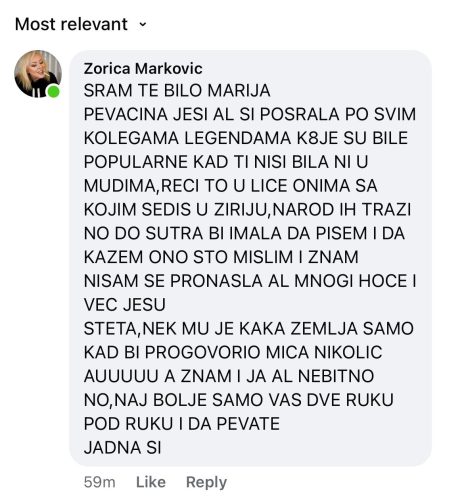 „Sram te bilo Marija! Pevačina jesi, ali si p*srala po svim kolegama legendama koje su bile popularne kad ti nisi bila ni u m*dima. Reci to u lice onima sa kojima sediš u žiriju. Narod ih traži. No, do sutra bih imala da pišem i da kažem ono što mislim i znam. Nisam se pronašla, ali mnogi hoće i već jesu“, izričita je bila Zorica, koja je spomenula i čuvenog muzičara Miodraga Nikolića. On je, inače, bio bivši muž njene majke Verice.