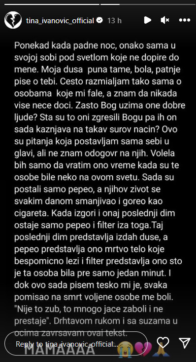 -Ponekad kada padne noć, onako sama u svojoj sobi pod svetlom koje ne dopire do mene, moja duša puna tame, bola i patnje piše o tebi.Često razmišljam tako sama o osobama koje mi fale, a znam da nikad neće doći. Zašto Bog uzima one dobre ljude? Šta su to oni zgrešili Bogu da ih on sada kažnjava na ovako surov način? Ovo su pitanja koja postavljam sama sebi u glavi, ali ne znam odgovor na njih – počela je Tina pa dodala: