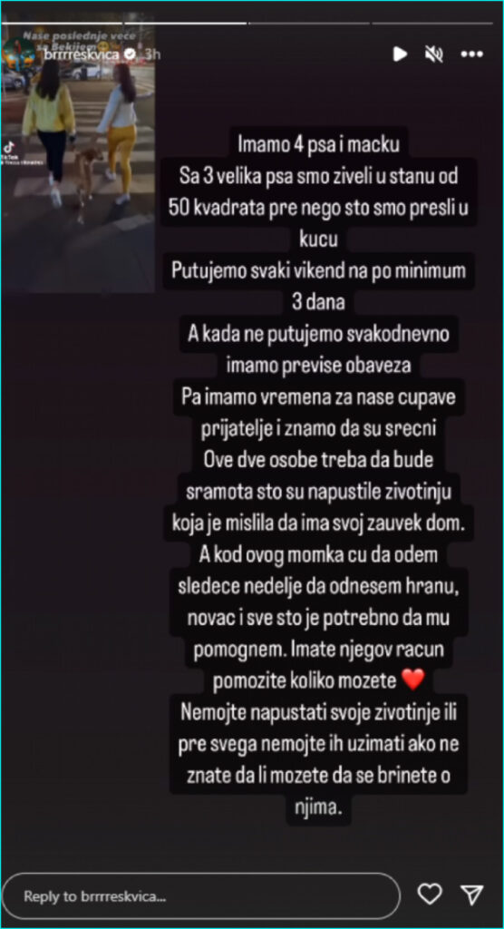 – Kod ovog momka ću da odem sledeće nedelje da odnesem hranu, novac i sve što je potrebno da mu pomognem. Imate njegov račun, pomozite koliko možete. Nemojte napuštati svoje životinje ili, pre svega, nemojte ih uzimati ako ne znate ili ne možete da se brinete o njima – napisala je Breskvica na Instagram „storiju“.