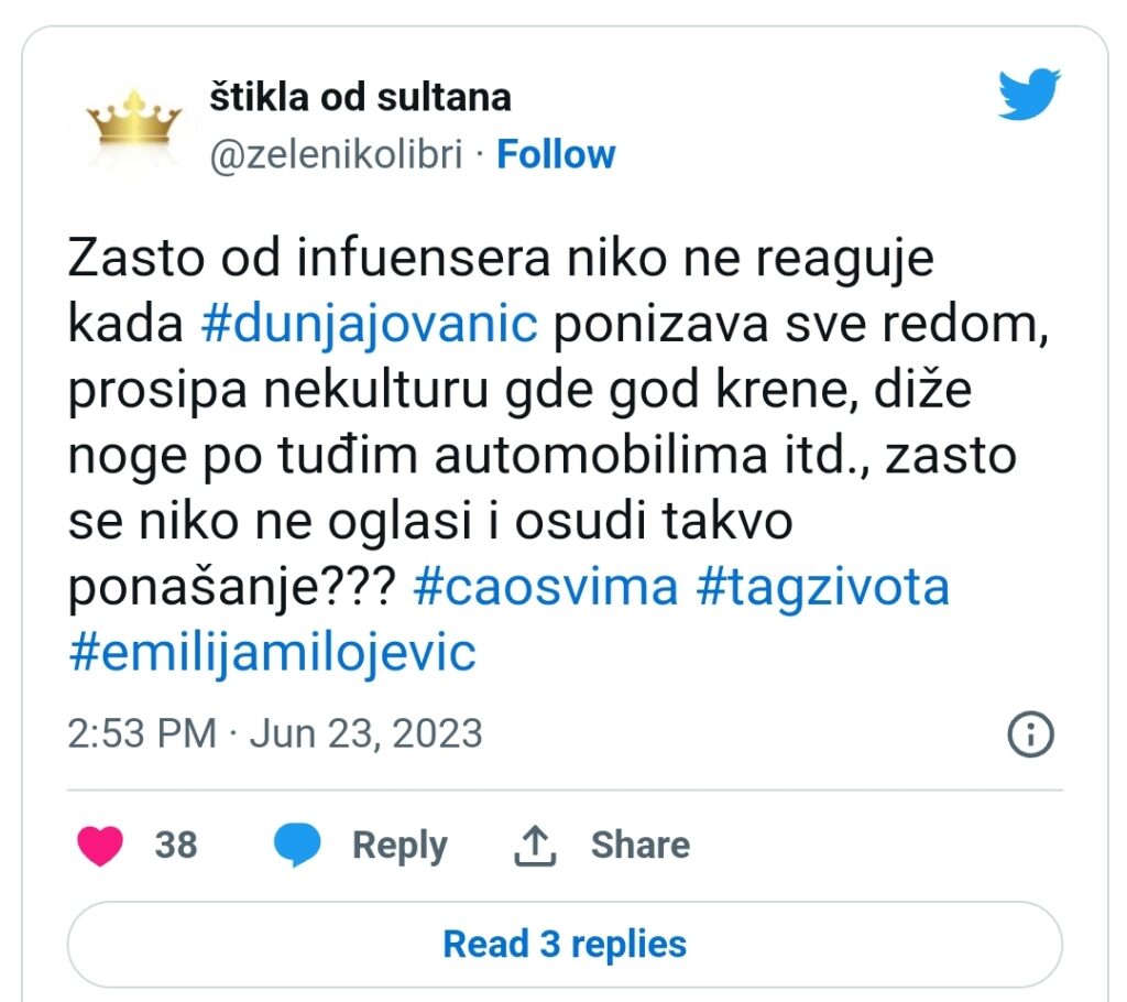 – Rijana treba drugi put da se okoti – rekla je Dunja u storiju.Ipak, kada je shvatila šta je rekla, te da su joj u inboks odmah stigle poruke kritike, Jovanićeva je snimak obrisala.Međutim, veliki broj ljudi je već video i čuo njenu izjavu, zbog čega su je napali, naročito na Tviteru.
