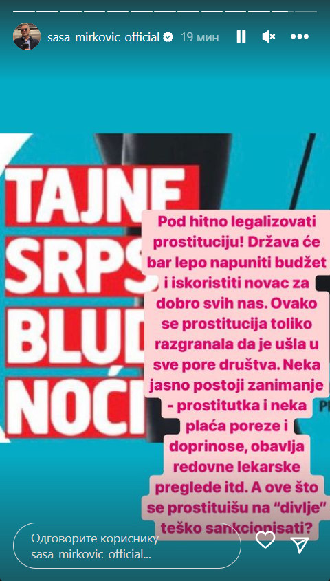 Međutim, Mirković ne želi da se zaustavi na ovim uspesima u svojoj karijeri. On je sada odlučuje da se založi i za legalizaciju prostitucije u Srbiji. Ovaj kontroverzni potez, bez sumnje, naićiće na protivljenje mnogih, ali Mirković veruje da je to neophodno za poboljšanje životnih uslova žena koje se bave ovim poslom.
