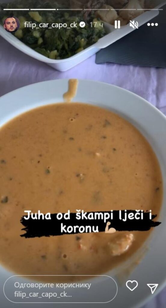 Naime, Filip je uslikao kako jede čorbu od škampa i napisao da ona leči čak i koronu, što je odmah zabrinulo sve koji ga prate, jer su posumnjali da se on zarazio i da mu je zdravlje ugroženo. No, istina je zapravo da je Aleksandra pokupila virus.