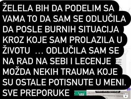 U jeku drame, Aleksandra je na Instagram storiju objavila da je počela da radi na sebi i da se obratila jednom centru za stručnu pomoć.