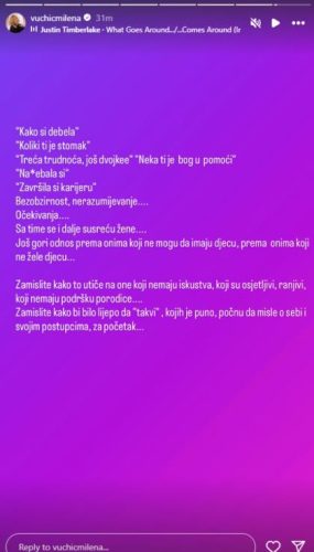 – „Kako si debela, koliki ti je stomak, treća trudnoća, još dvojke, neka ti je Bog u pomoći… Na**bala si, završila si karijeru…“ Bezobzirnost, nerazumevanje, očekivanja… Sa time se i dalje susreću žene… Još gori odnos prema onima koji ne mogu da imaju decu, prema onima koji ne žele decu… – napisala je Milena Vučić na Instagramu.
