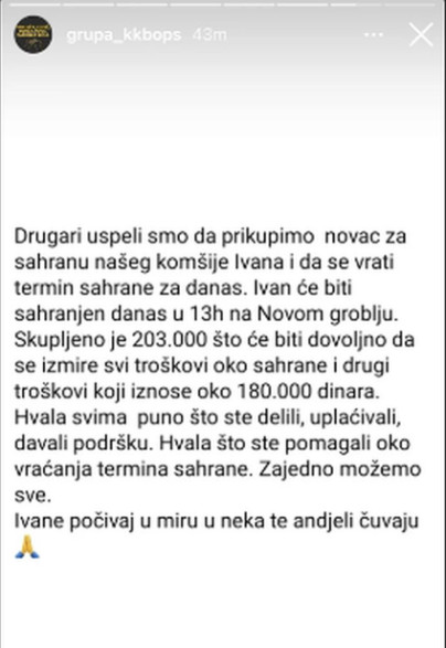 „Drugari uspeli smo da prikupimo novac za sahranu našeg komšije Ivana i da se vrati termin sahrane za danas. Ivan će biti sahranjen u 13h na Novom groblju. Skupljeno je 203.000 dinara što će biti dovoljno da se izmire troškovi oko sahrane i drugi troškovi koji iznose oko 180.000 dinara. Hvala svima puno što ste delili, uplaćivali, davali podršku. Hvala što ste pomogli oko vraćanja termina sahrane. Zajedno možemo se. Ivane, počivaj u miru, i neka te anđeli čuvaju“, navodi se u obaveštenju stranice koja je objavljeno jutros oko osam časova.