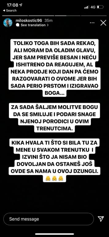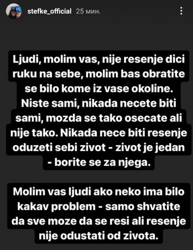 -Ljudi, molim vas, nije rešenje dići ruku na sebe, obratite se bilo kome iz vaše okoline, Niste sami, nikada nećete biti sami, možda se tako osećate ali nije tako. Nikada neće biti rešenje oduzeti sebi život. Život je jedan, borite se za njega. Sve može da se reši ali rešenje nije odustati od života. – napisao je Stefan na svom Instagram storiju.